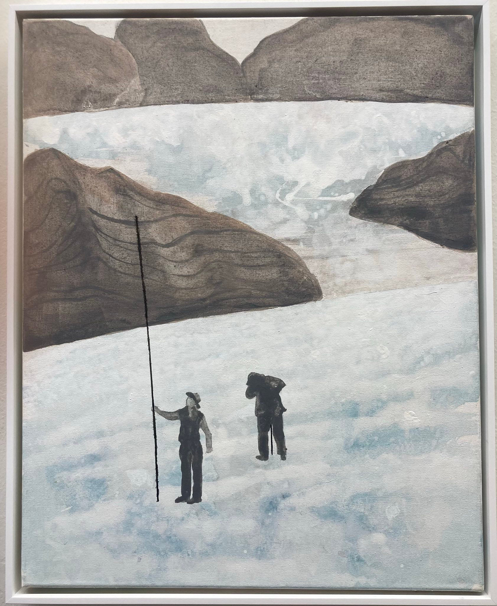 Die Glaziologen 1: zeigt eine immer noch fantatische Gletscherwelt in der der Mensch winzig klein erscheint und nimmt Bezug auf die Gebirgsbildern der Romantik, 2025, Acryl auf Leinwand, 70 x 50 cm