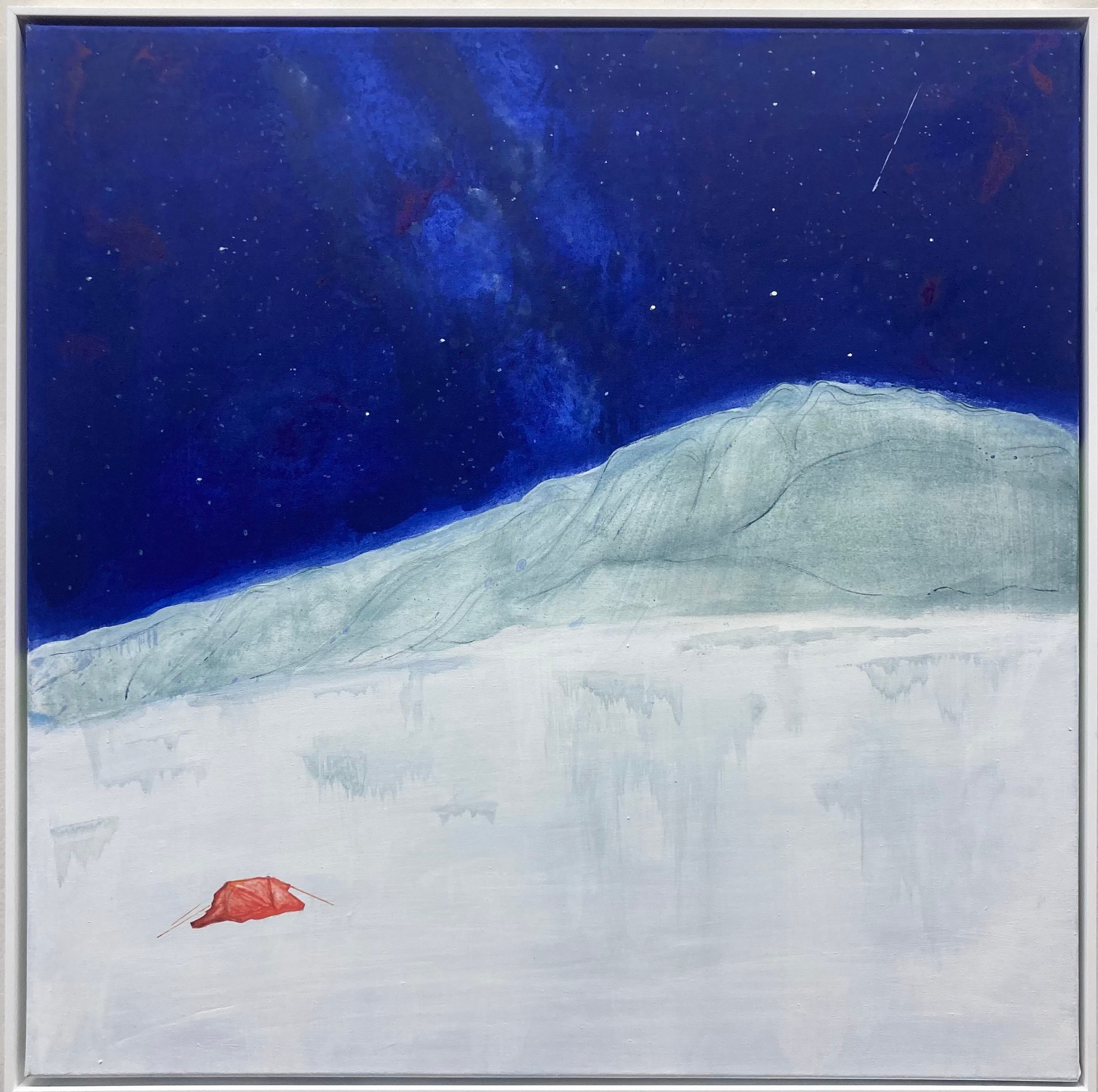 Die Glaziolgen 3: Isolierende Kunststoffe ermöglichen die Übernachtung auf dem Gletscher. Am sternübersäten Nachthimmel strahlen die Satelliten am hellsten, 2025, Acryl auf Leinwand, 70 x 70 cm