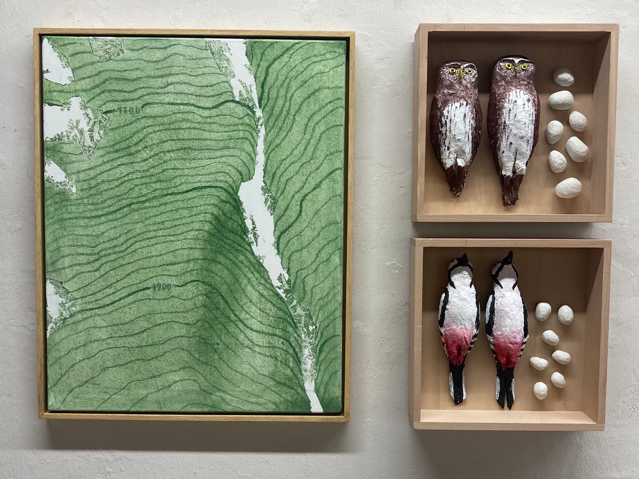 Installation Monique Rubin, Nestwald und Waldbewohner vor 28.05.2025, Acryl auf Leinwand und Holzmehl, Acryl in Holzkiste, 2025