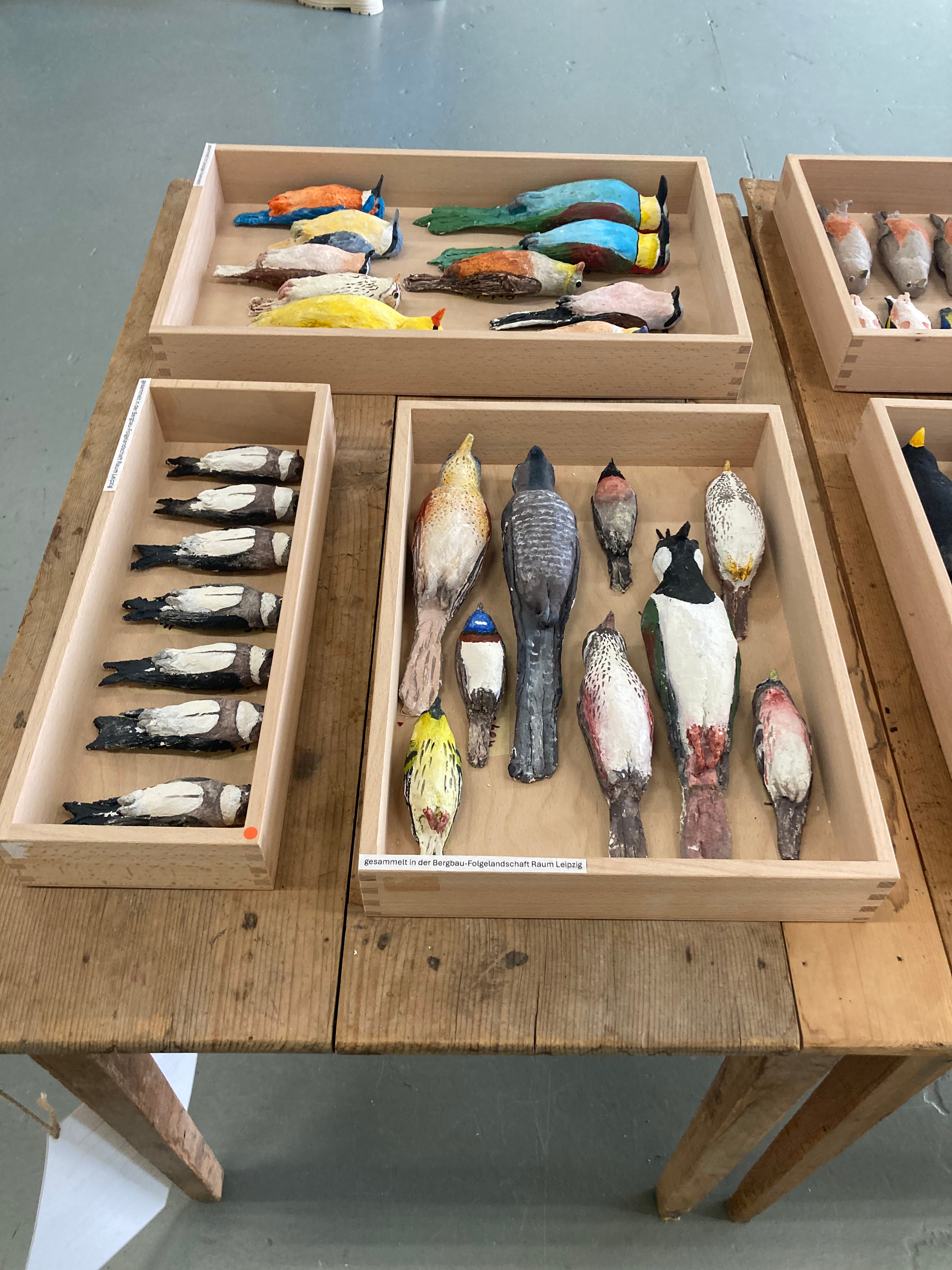Vogelbälge, ausgestellt in der Spinnerei, Leipzig 2024, Installation aus sechs Schaukästen, Holzmehl, Acryl