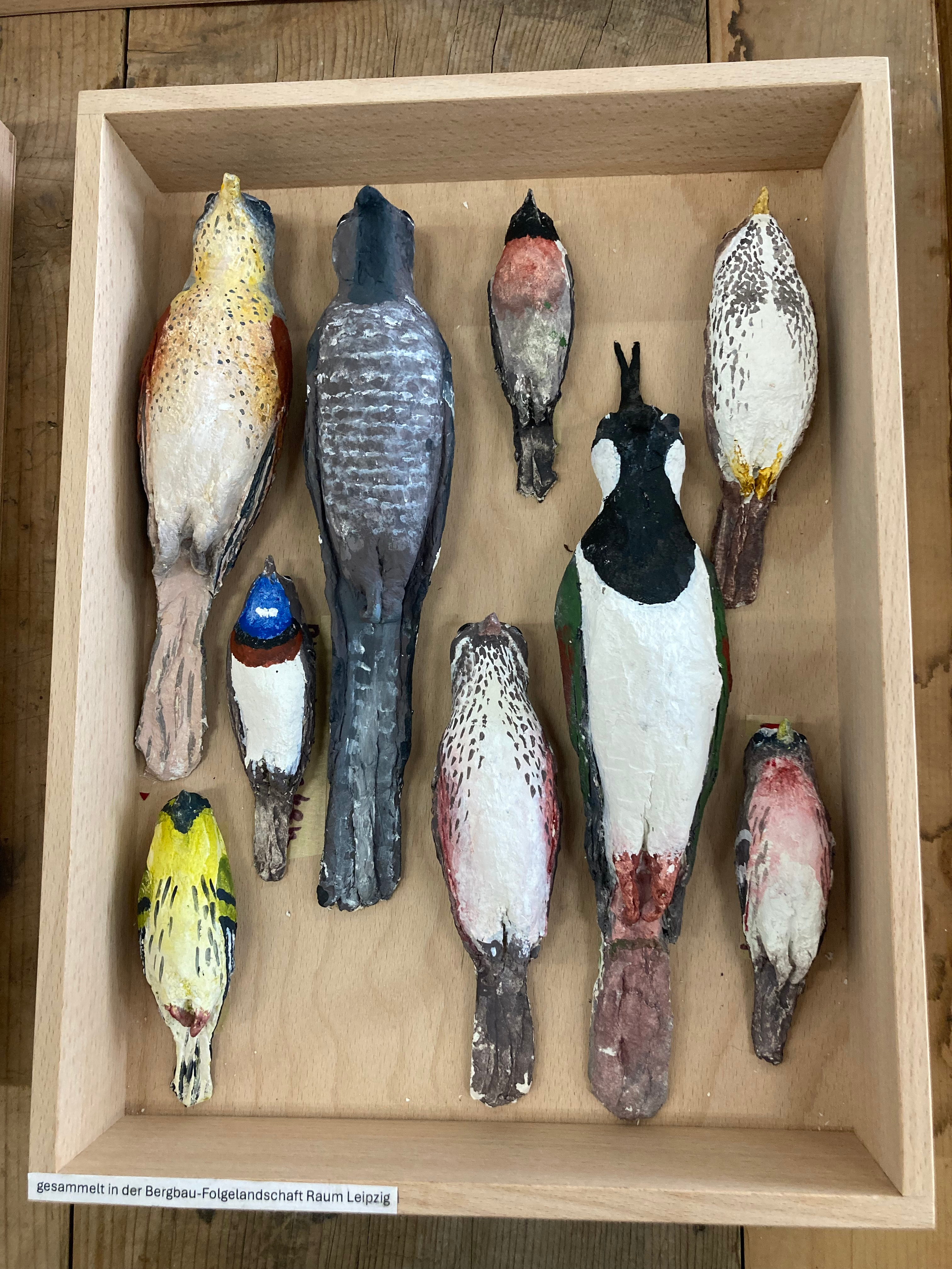 Und drei Schaukästen aus dem Gebiet Leipzig: Von Vögeln aus dem Auengebiet Leipzig, von Vögeln, die sich in der Folgelandschaft wieder ansiedeln, von Uferschwalben, die der neuentstandenen Dünen nisten.