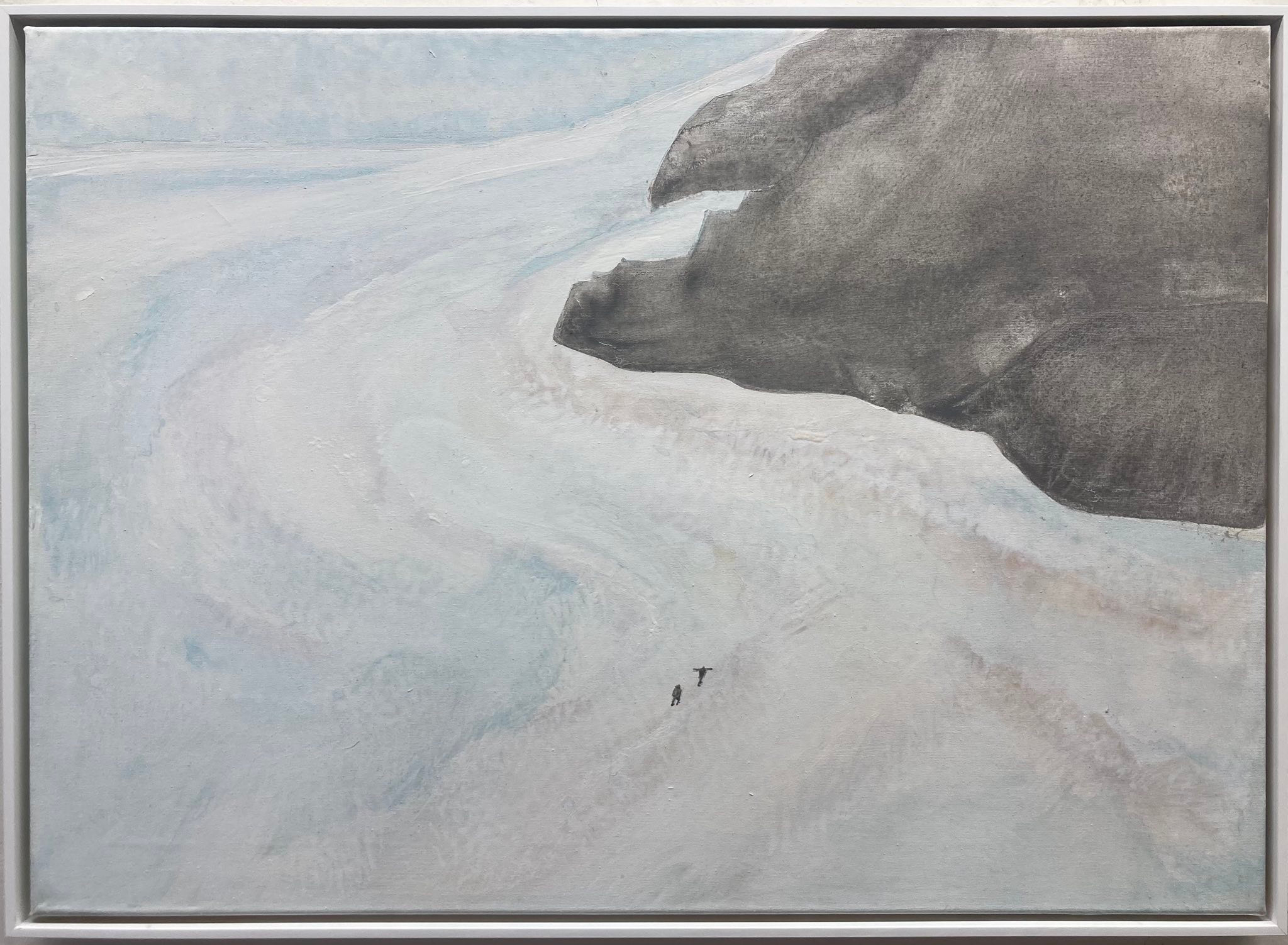 Die Glaziologen 1: zeigt eine immer noch fantatische Gletscherwelt in der der Mensch winzig klein erscheint und nimmt Bezug auf die Gebirgsbildern der Romantik, 2025, Acryl auf Leinwand, 70 x 50 cm