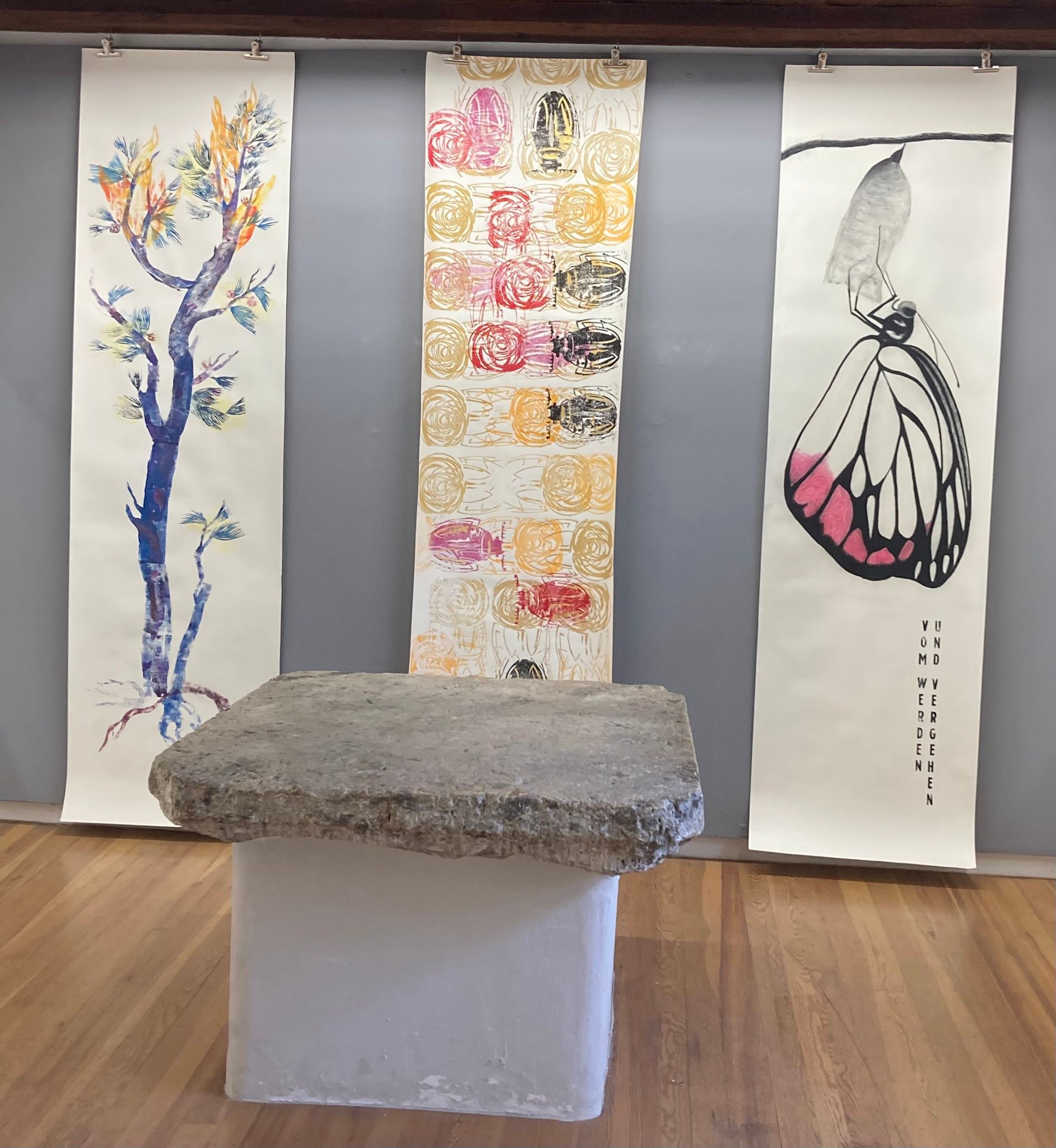 Fahne Monique Rubin, Schmetterling, Kohle, Druckgrafik auf Papier 70 x 250 cm